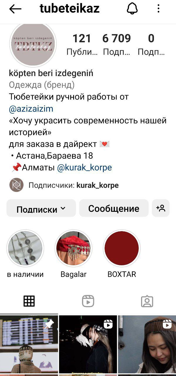 Әріптестерім мен таныстарым менің Инстаграмдағы посттарымды өз парақшаларында жариялады, осылайша тапсырыс ала бастадым. Мен өзімді мақтан тұтып, шабыттана бастадым, өйткені, мен ұлттық мәдениетті жандандырып жатырмын.Тапсырыстар негізінен Инстаграмнан түскендіктен, біз парақшамызды белсенді дамытудамыз, тақиялардың жаңа топтамаларымен, сырға, сақина, шолпы секілді қолдан жасалынған зергерлік бұйымдармен контент жасаймыз